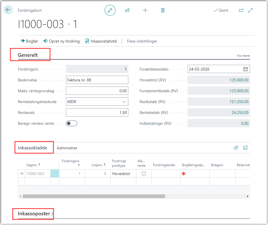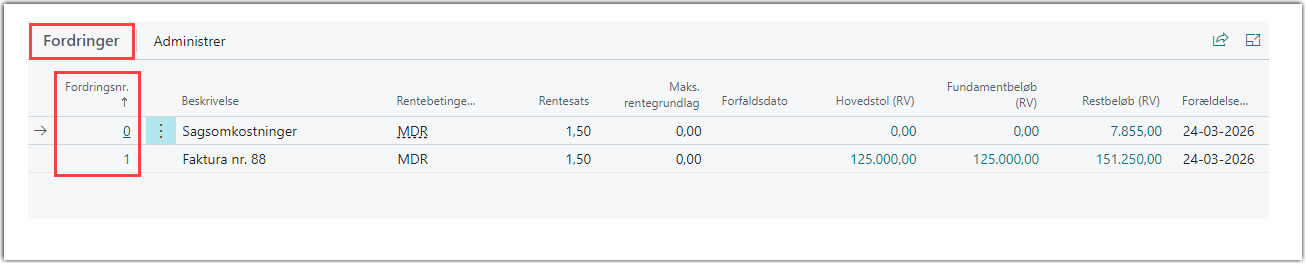 Hver fordring har sit eget fordringskort, der kan åbnes ved at klikke på fordringsnr. eller ved at bruge Rediger i båndet