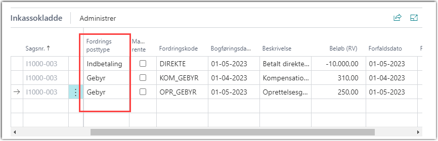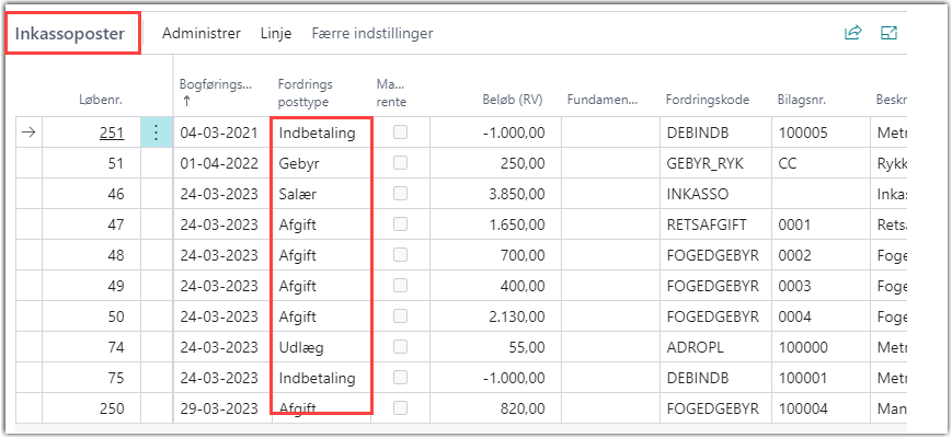 Under Inkassoposter vises de poster, som er på sagen, altså indbetalinger fra skyldner, gebyrer og udlæg.