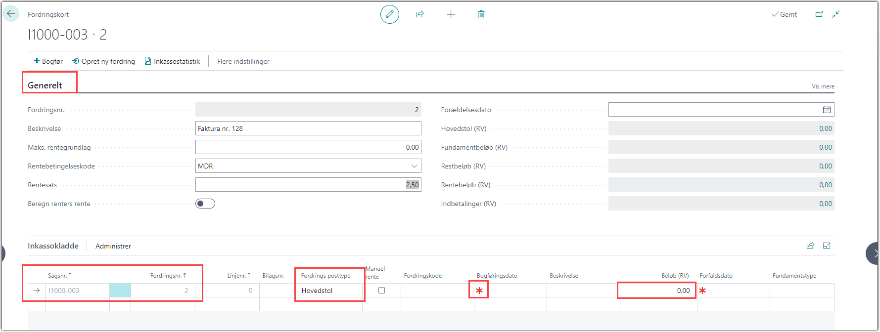 På fordringskortet udfyldes data under Generelt, og under Inkassokladde er præ-udfyldt sagsnr., fordringnr. og Fordrings posttype (hovedstol).