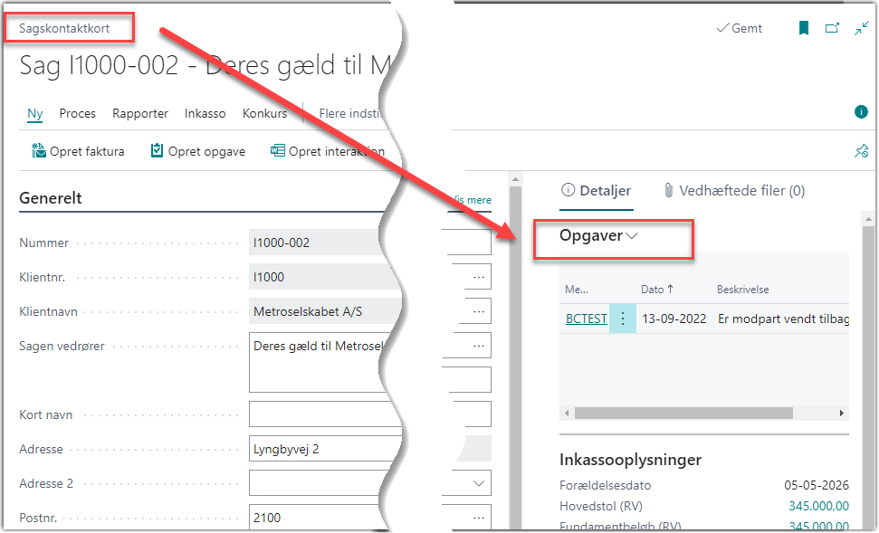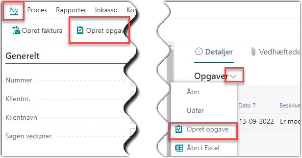 På sagskortet kan der oprettes opgaver fra båndet eller fra selve faktaboksen Opgaver