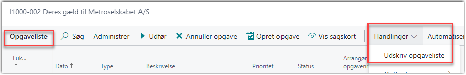 Opgavelisten kan også udskrives direkte fra rollecentret under Forfaldne opgaver og under Handlinger.